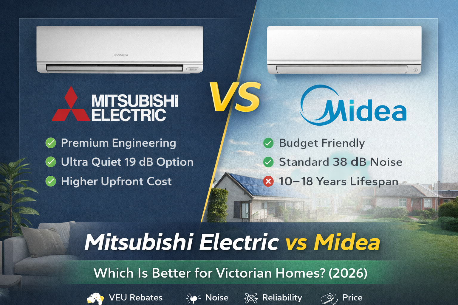 The Victorian Energy Upgrades program supports energy-efficient reverse cycle air conditioners, and both Mitsubishi Electric and Midea systems can qualify when installed according to program requirements.